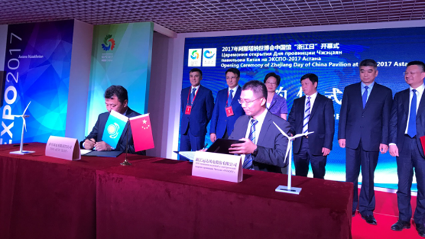 開幕式上,威尼斯9499登錄入口風(fēng)電與哈薩克斯坦薩爾風(fēng)電公司在阿斯塔納世博會(huì)浙江日舉行戰(zhàn)略合作協(xié)議簽約儀式,哈薩克斯坦Shar wind turbines LLP項(xiàng)目公司總經(jīng)理庫(kù)那分?托卡塔博拉特及威尼斯9499登錄入口風(fēng)電副總經(jīng)理斯建龍出席,哈方能源部部長(zhǎng)馬克沃夫·馬拉杜勒與浙江省副省長(zhǎng)梁黎明、中國(guó)駐哈薩克斯坦大使張漢暉見證了雙方合作的簽訂。