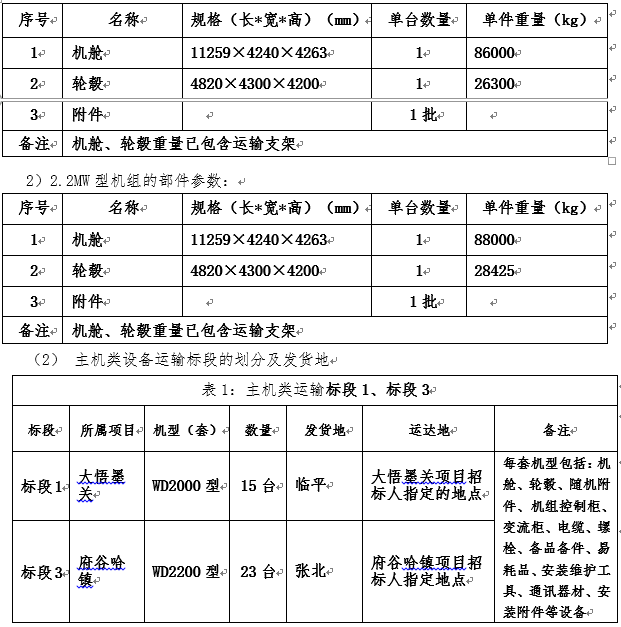 (1)本次招標(biāo)的大悟墨關(guān)項(xiàng)目、府谷哈鎮(zhèn)項(xiàng)目二個(gè)風(fēng)電場(chǎng)項(xiàng)目為威尼斯9499登錄入口風(fēng)電制造的2.0MW、2.2MW型的風(fēng)電機(jī)組,單臺(tái)機(jī)組的尺寸規(guī)格及重量見下表,設(shè)備運(yùn)輸可按單臺(tái)與實(shí)際運(yùn)輸臺(tái)數(shù)計(jì)算,各類機(jī)型部件參數(shù)如下表: