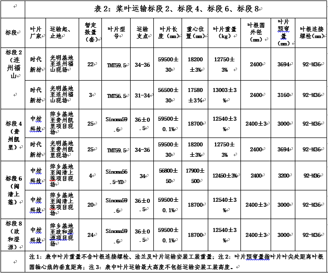 2.2? 槳葉運(yùn)輸(含長(zhǎng)途運(yùn)輸、道路改道、二次轉(zhuǎn)運(yùn)等)標(biāo)段的劃分及運(yùn)輸技術(shù)參數(shù)